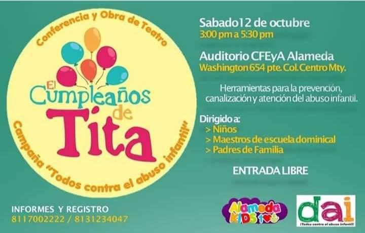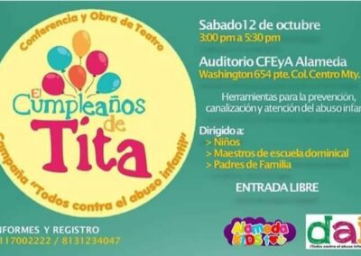 Tremenda presentación de la obra «El Cumpleaños de Tita» el sábado 12 de octubre en el Auditorio del Centro CFEyA Alameda, donde un poco más de 200 pequeños junto con sus padres recibieron la capacitación sobre prevención del abuso sexual infantil.